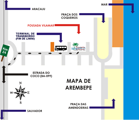 Com uma excelente posição geográfica, no centro da extensão de 42km do litoral de Camacari,Arembepe possibilita que o visitante se hospede e conheça todas as praias do litoral norte da Bahia, inclusive através do transporte coletivo, com opções de percursos a partir do terminal de transbordo deArembepe, a 50m da Pousada Vilamar.